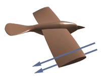As the bird is flapping along, it needs to make sure it has the correct angle of attack all along its wingspan. Since the outer part of the wing moves up and down more steeply than the inner part, the wing has to twist, so that each part of the wing can maintain just the right angle of attack. The wings are flexible, so they twist automatically. This picture shows how the wing must twist in the downstroke, to keep each part of the wing aligned with the local direction of travel. Airplane propellers also have a twisted shape, but their continual rotation means the shape doesn't have to change.